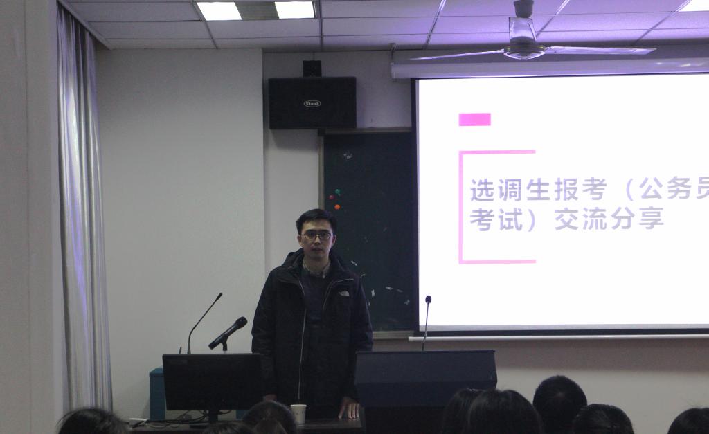 会上,左庆翔结合自身经历,从什么是选调生、选调生报考条件、江苏省公考项目等方面进行介绍,让学生们认识到公务员工作的状况,并非是 “一张报纸、一杯茶”那样轻松,平日的工作需要解决大大小小的问题。随后他就公考方面,为学生分享了他个人的备考经验及建议,同时强调在备考的过程中应关心民生热点,关注时事动态,在平时积累写作素材。活动最后,同学们对有关考试技巧和备考规划等方面提出了自己的问题。