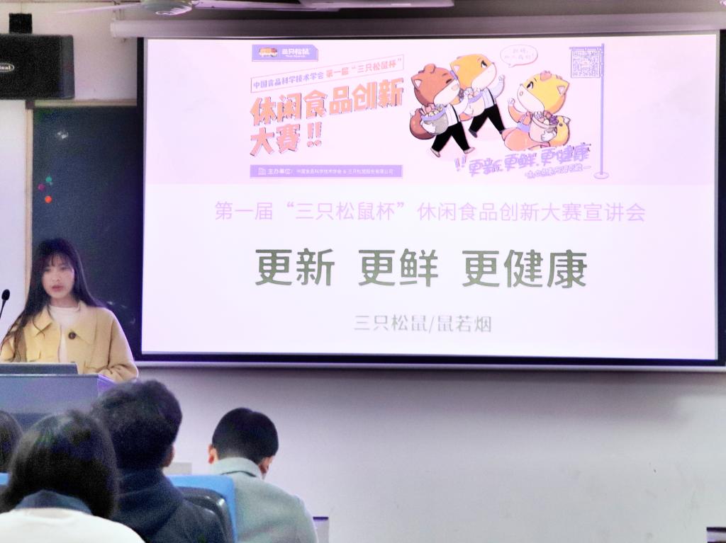 3月13日,“三只松鼠杯”休闲食品创新大赛宣讲会在食品楼215报告厅举行。本次大赛旨在提升学生的创新创业能力,为广大食品学子提供实践与技能展示的平台。本次活动由365best体育亚洲官网辅导员陈宏强主持。中国食品科学技术协会赛事组委会沙菲,三只松鼠有限公司代表谢婷婷出席了本次活动。