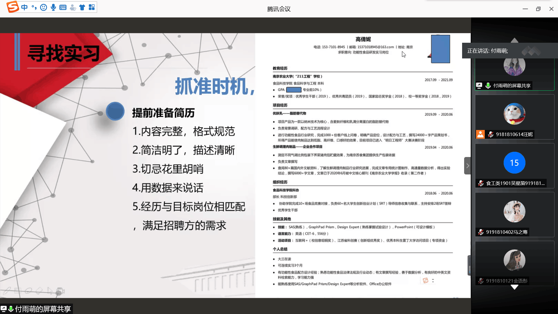 高倩妮同学着重介绍了如何寻找实习岗位。暑期实习是针对大三和研二的同学,时间短,主要集中在6-8月,而且有转正的名额,但是面试周期长、应聘难度大,需要同学们提前做好应聘准备。最后她总结道,实习期间要多听多看多学,注意吸收借鉴别人的工作经验,尽早适应校园以外的环境。
