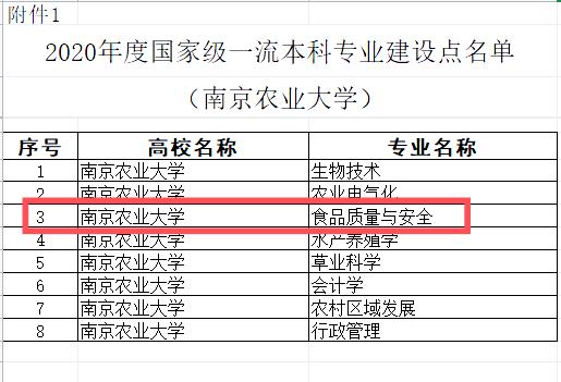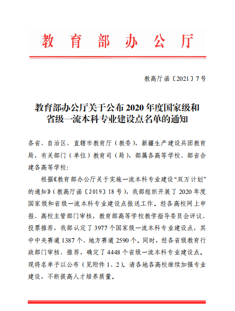 近日,教育部办公厅印发《关于公布2020年度国家级和省级一流本科专业建设点名单的通知》(教高厅函〔2021〕7号),365best体育亚洲官网“食品质量与安全”专业入选“2020年度国家级一流本科专业建设点”。