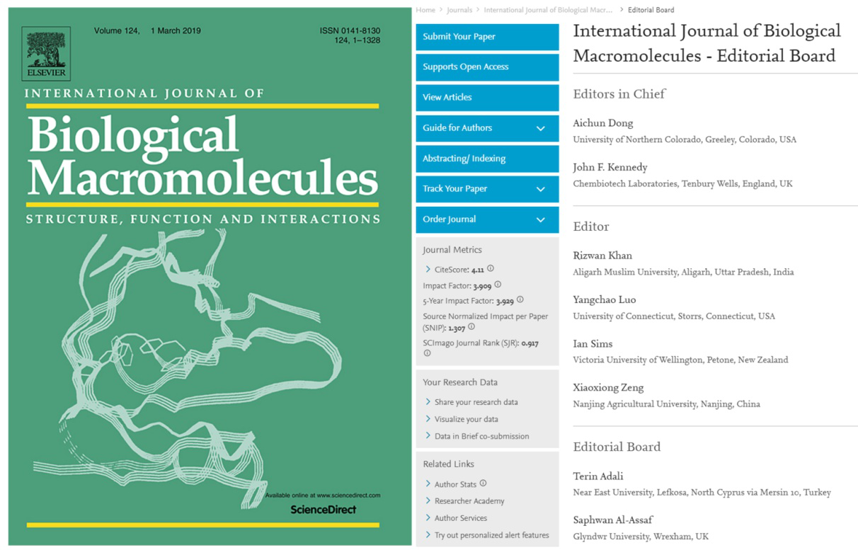 应ELSEVIER出版社邀请,学院曾晓雄教授于2019年1月起担任国际著名期刊《International Journal of Biological Macromolecules》副主编。《International Journal of Biological Macromolecules》创刊于1979年,由荷兰ELSEVIER出版发行,该期刊最新的影响因子为3.909。该杂志自出版发行以来,一直是天然大分子领域的国际权威期刊之一,主要发表蛋白质、大分子碳水化合物、糖蛋白、生物多酸和核酸等分子结构和性质的最新研究成果,其范围包括生物活性与相互作用、分子缔合、化学与生物修饰以及功能特性等。