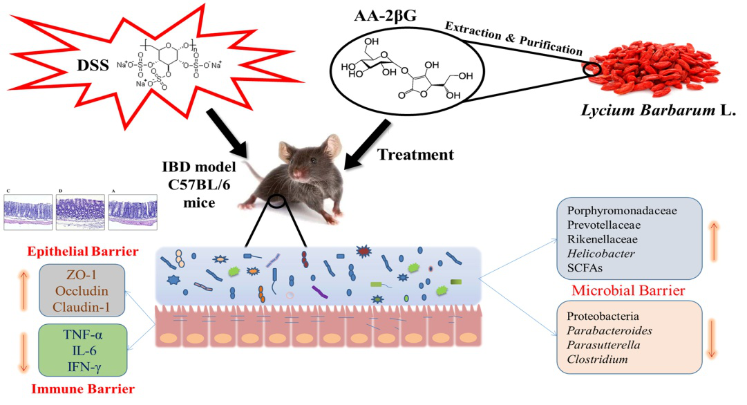 该研究表明红果枸杞中一种抗坏血酸衍生物2-O-β-D-葡萄糖基-L-抗坏血酸(AA-2βG)对葡聚糖硫酸钠(DSS)诱导的结肠炎小鼠有抗炎症活性,并对肠道菌群有一定的调节作用。该研究成果获得了匿名审稿专家的肯定,为AA-2βG的抗炎症活性提供了新的支持,同时为枸杞中活性成分AA-2βG的开发提供了科学理论依据。该研究得到了365best体育亚洲官网365best体育亚洲官网SRT项目(1818C01)、宁夏回族自治区重点研发项目(2018YBZD1915)和江苏高校优势学科建设工程资助项目的资助的支持。