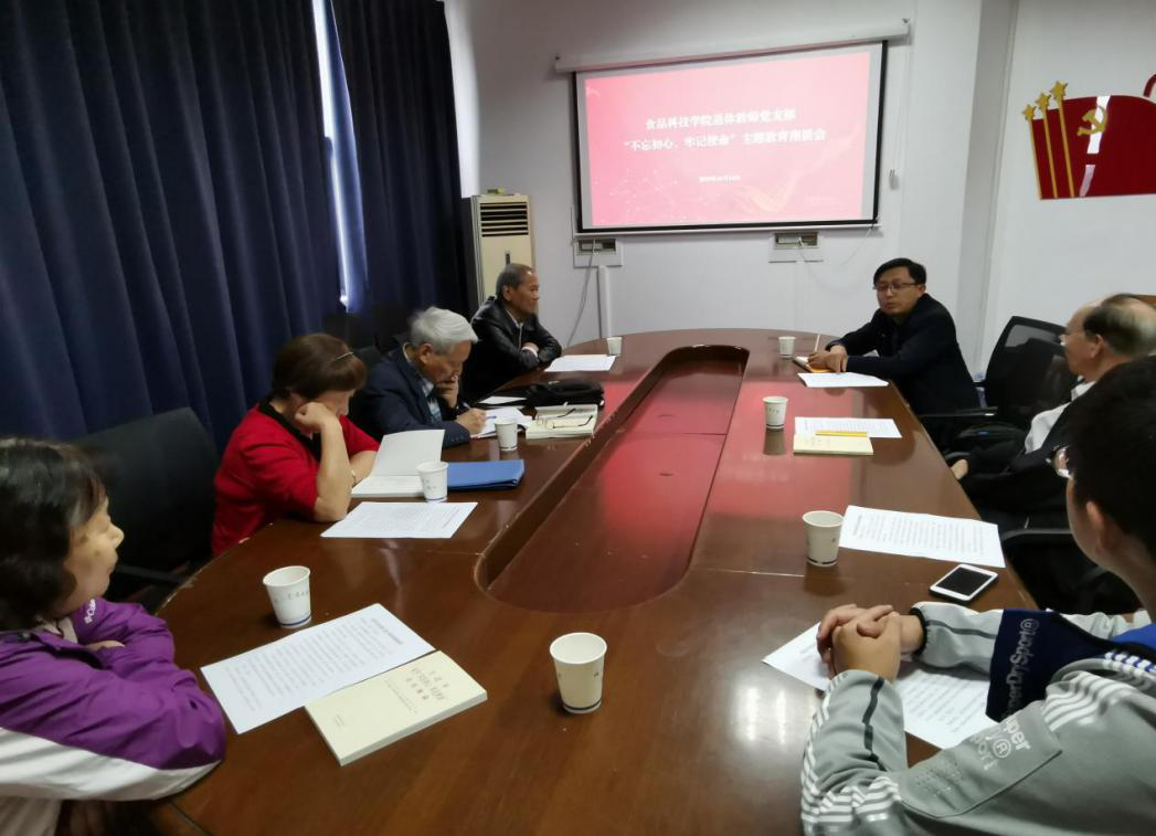 10月14日下午,365best体育亚洲官网离退休教师党支部在食品院党员活动室举办“不忘初心、牢记使命”主题教育学习会。学院党委书记朱筱玉出席了座谈会,支部六位退休党员参加此次活动。座谈会由学院离退休党支部书记江汉湖教授主持。