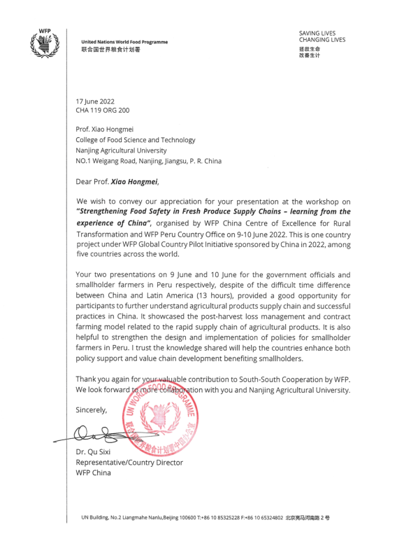 近日,365best体育亚洲官网收到来自联合国世界粮食计划署的感谢信,感谢我院肖红梅教授对“南南合作”工作的大力支持。