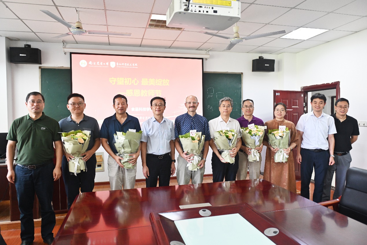 胡副校长首先代表学校为食品院教师送上教师节的祝福,肯定了学院在人才培养、科学研究、社会服务方面取得的成绩,获批“肉品质量控制与新资源创制”全国重点实验室,取得了重大突破。胡副校长为获得本年度“优秀教师”的潘磊庆教授颁发获奖证书和奖杯,向会教师代表送上鲜花,对入选国家级人才、江苏省教学名师等的教师表示祝贺,并慰问了援疆人员家属,与他们进行座谈交流,并向全体教职员工致以节日的祝福。