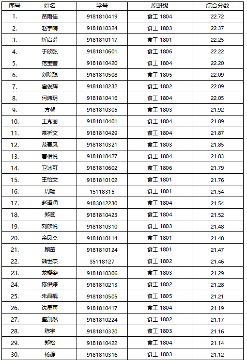 根据《2018 级“复合应用型”食品科学与工程卓越农林人才培养计划选拔方案》和《365best体育亚洲官网 2018 级大类招生专业分流实施办法》,经相应的考核程序,拟录取 30 名同学入选 2018 级“复合应用型” 食品科学与工程(卓越班),现将名单予以公示。