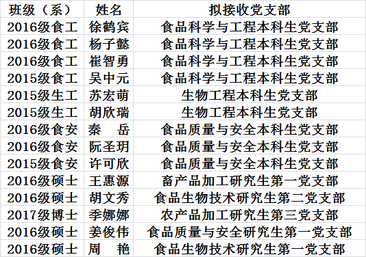 根据《中国共产党章程》、《中国共产党发展党员工作细则(试行)》的有关规定,经团支部推优、入党介绍人谈话考察、学生党支部答辩和投票表决、学校及学院党组织一年以上的线上和线下系列培训教育,以及对发展对象的志愿服务、任职经历、科研水平、学业成绩、创新能力等的综合考察,现拟将徐鹤宾等14位同志确定为党员发展对象。现将具体名单公示如下: