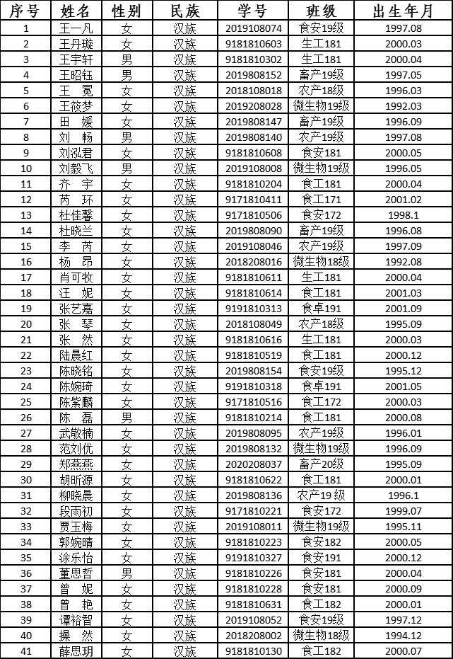 根据《中国共产党章程》、《中国共产党发展党员工作细则(试行)》的有关规定,经团支部推优、入党介绍人谈话考察、学生党支部答辩和投票表决、学校及学院 党组织一年以上的线上和线下系列培训教育,以及对发展对象的志愿服务、任职经历、科研水平、学业成绩、创新能力等的综合考察,现拟将王一凡等 41 位同志确定为党员发展对象。现将具体名单公示如下(按姓氏笔画排序):
