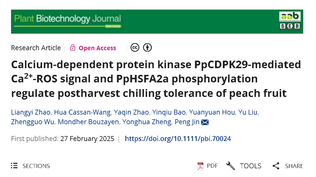 近日,Plant Biotechnology Journal在线发表了365best体育亚洲官网郑永华教授和金鹏教授课题组题为“Calcium-dependent protein kinase PpCDPK29-mediated Ca2+-ROS signal and PpHSFA2a phosphorylation regulate postharvest chilling tolerance of peach fruit”的研究论文,该研究揭示了钙依赖蛋白激酶PpCDPK29通过Ca2+-ROS信号通路以及对PpHSFA2a磷酸化作用调控桃果实采后冷害的分子机制。