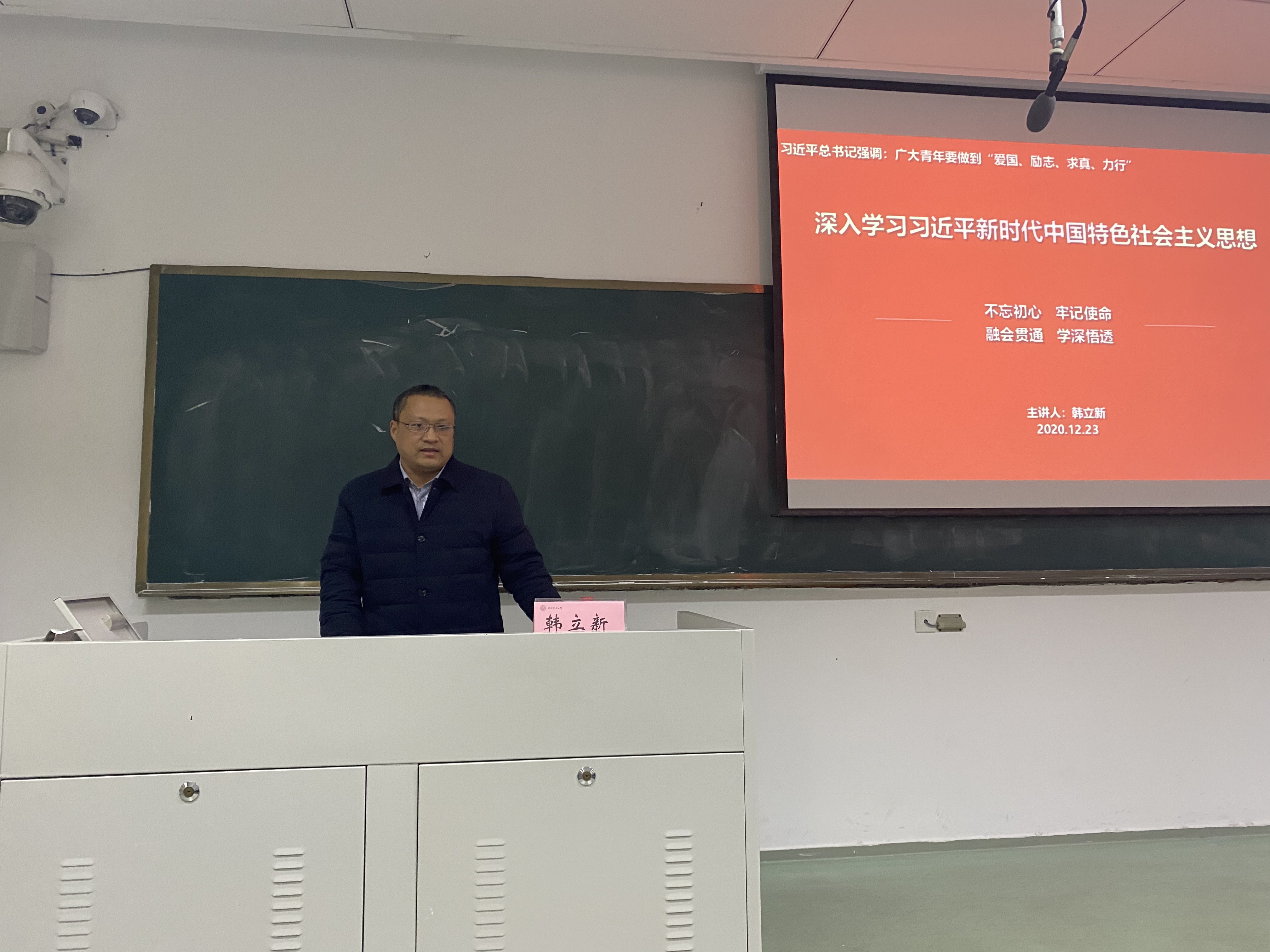 为进一步做好入党积极分子教育培训工作,深入实施线上教学、线下教学、实践教学“三位一体”的教育培训体系,切实提高党员发展质量,12月23日下午,365best体育亚洲官网入党积极分子线下专题党课在主楼201成功举行。学院邀请外国语学院党委副书记韩立新以《深入学习习近平新时代中国特色社会主义思想》为题讲授专题党课,学院2020年100余位入党积极分子参加,活动由学院本科生辅导员韩宁主持。