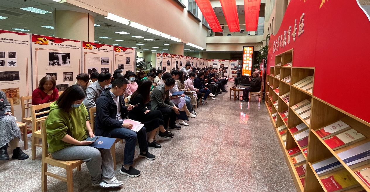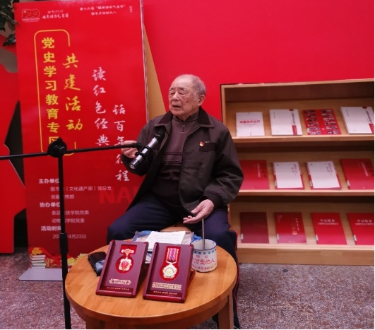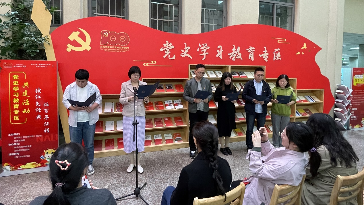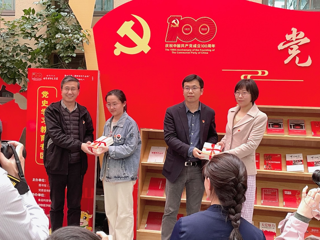 历史是最好的教科书,中国革命历史是最好的营养剂。为了迎接中国共产党百年华诞,2021年4月23日,365best体育亚洲官网图书馆党总支和党委宣传部在图书馆一楼联合举办了第十三届“腹有诗书气自华”读书月之“党史学习教育专区”共建活动。365best体育亚洲官网食品质量与安全教工党支部(以下简称食安教师支部)和动医学院研究生党支部共同参与了此次党史学习教育。365best体育亚洲官网党委书记孙健、副院长辛志宏应邀出席了本次活动。