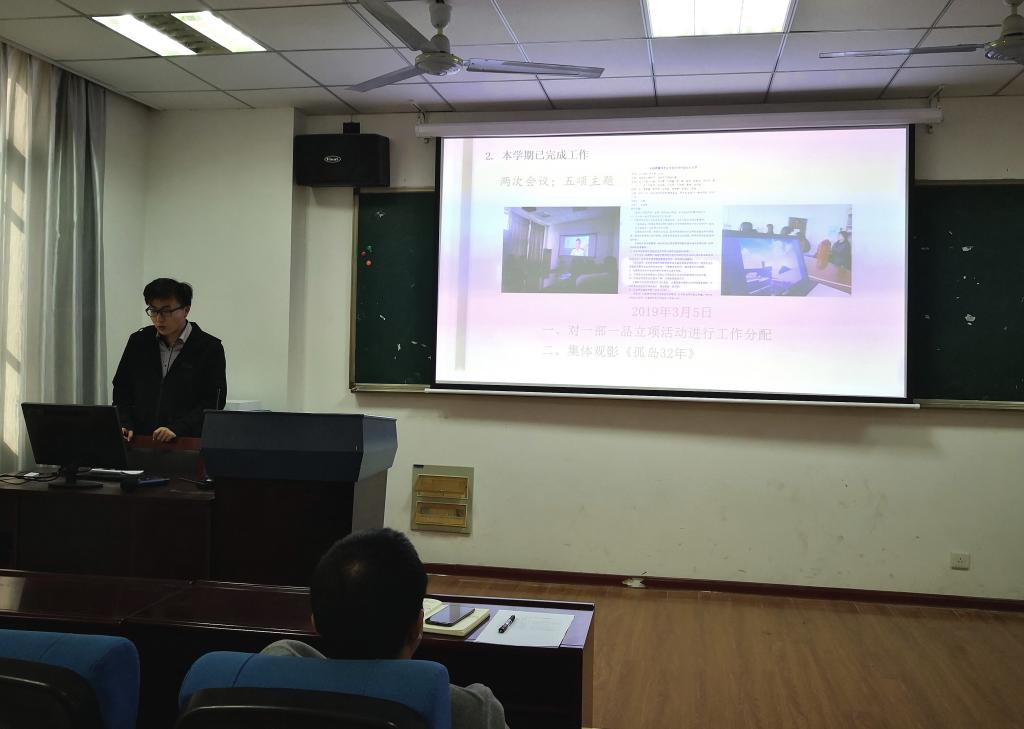 陈宏强结合学院实际,对本学期重点工作安排如下:一是加强党支部制度建设和组织建设,贯彻落实“三会一课”、组织生活会制度,持续推进“两学一做”制度化常态化;二是做党支部好民主评议党员工作,开展谈心谈话,深入查摆问题,开展述职评议,抓好问题整改;三是规范党员发展流程,按照“控制总量、优化结构、提高质量、发挥作用”的要求做好发展党员工作;四是创新主题党日活动内容,善于运用多种形式,结合2019年国家重大政治事件,发挥专业优势,结合同学成长需求,做好活动主题和内容的设计;五是积极配合学校和学院党委,做好学校第十二次党员代表大会筹备工作。